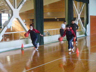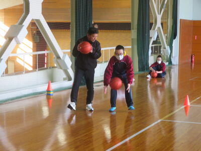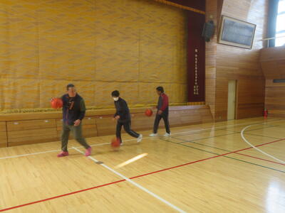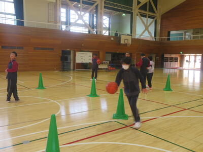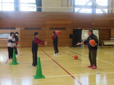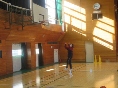 バスケットボールではボールを用いての体操、パスやドリブルに取り組んでいます。ボールが大きいので扱いも難しいのですが、楽しみながら取り組めているようで笑顔がたくさん見られます。