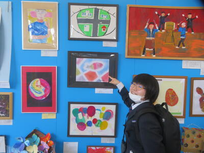 県庁で行われたハートフルアート展を見学しました。他校の児童生徒作品に興味を示し、「これおもしろい」「すごくきれい」などの感想が聞かれました。