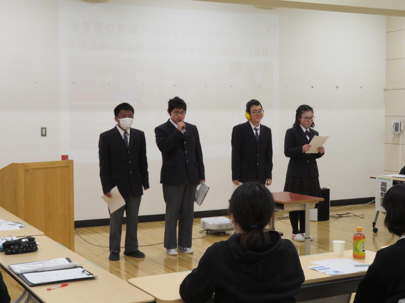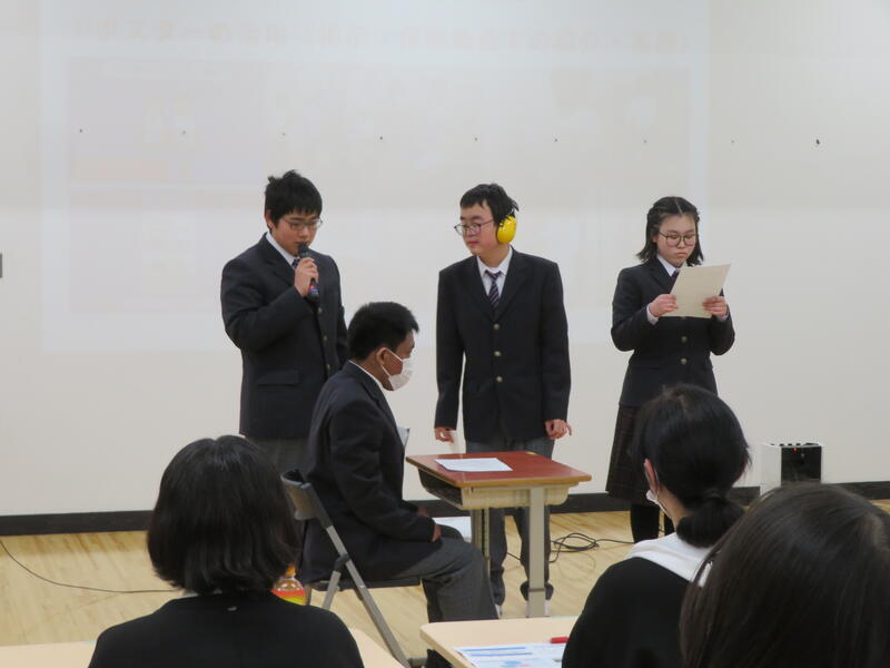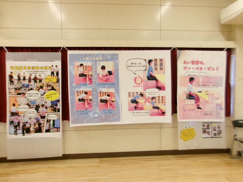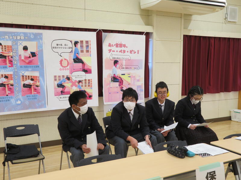 高等部保健委員会の生徒がCanvaを用いて作成したポスターを紹介し、「グー・ペタ・ピン」を合言葉に正しい姿勢の整え方を実践しました。