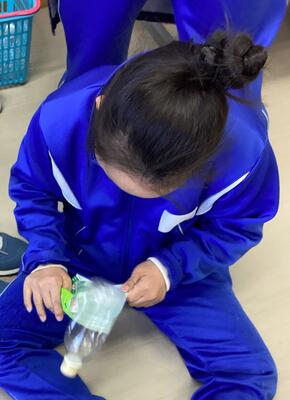 寒い体育館での活動にも生徒は元気いっぱい、体育では「ベースボール」に取り組んでいます。生徒個々で技術に差はありますが、キャッチボールをしたり、交代でバッティングや守備を行ったりしています。元ソフトボール部の2名の打球は力強く、体育館2階へのホームランも飛び出します。