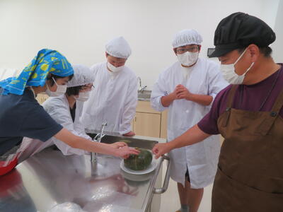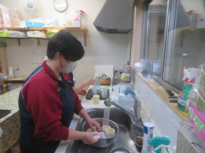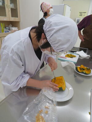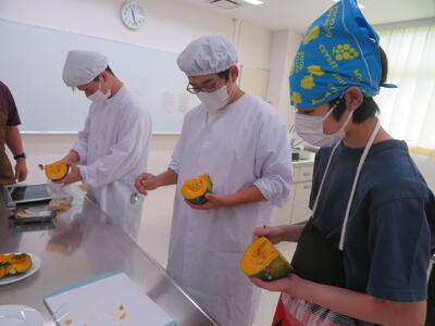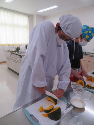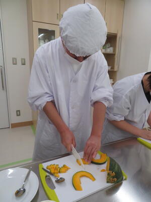 植物を育てようと題し、畑でカボチャを栽培しました。その一環として自分たちで育て収穫したカボチャを用いて調理をしようと相談しました。まずは簡単なことからやってみようとスライスしてから電子レンジで加熱し、市販のカップ味噌汁に足し、持参した弁当と一緒に食しました。安全に留意し、「猫の手」を意識して切りました。また、自分が食べやすい大きさになるようにそれぞれ考えて切ることができました。「切るのは大変だったけど、頑張って切っておいしいものができて良かった」「具材のかぼちゃは下に沈んでしまい他の具材のように上からは見えないけど、味噌汁に入れてもおいしい」という感想があり、みんなでおいしく食べることができました。