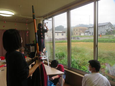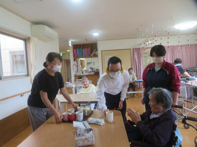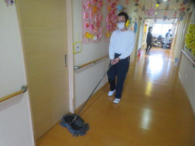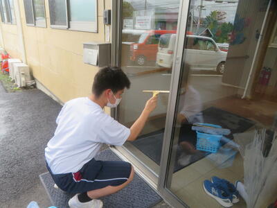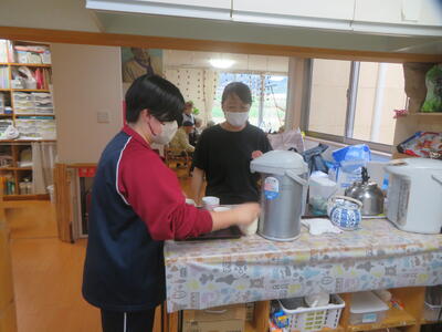 清掃奉仕や湯茶サービスを通して地域の人々との交流を図ると共に働くことへの意識の向上をねらいに、校外での作業学習を実施しました。学校近隣の小規模多機能ホーム「ぽっかぽかの家」にご協力いただき、生徒4名、職員2名で訪問し、普段の学習の成果を発揮することができました。主な活動として施設内の窓清掃と利用されている皆様へのお茶出しを行いました。作業学習で取り組んでいる清掃や喫茶サービスの経験を活かし素早くかつ丁寧に取り組むことができました。皆様から笑顔で温かく迎えていただき、施設長様からは「手際よくできていて驚きました」と褒めていただきました。参加した生徒も「緊張したけど、できた」「お年寄りの皆さんに喜んでもらえてよかった」と喜ぶ姿が見られ、貴重な体験の場となりました。