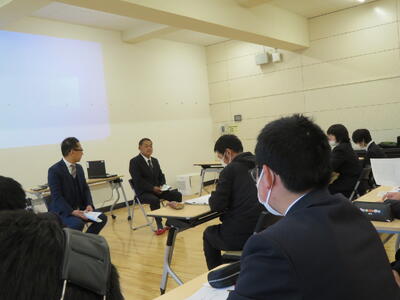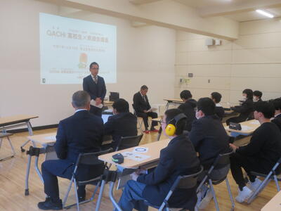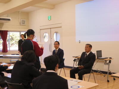 政治への関心を高めることを目的に、群馬県議の秋山健太郎議員、斉藤優議員が来校し、政治の仕組みについてスライドを用いて解説していただきました。難しい内容でもあるのでクイズを交えることで生徒も頷いたり、笑顔を見せたりと興味をもって説明を聞いている様子が見られました。