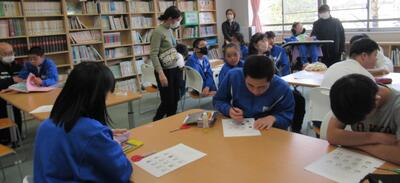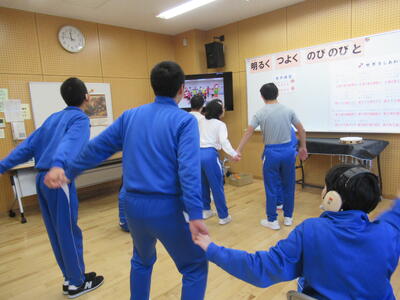 音楽の時間には、人権キャラクターソング「世界をしあわせに」の歌に合わせて踊ったりリズム打ちをしたりしました。